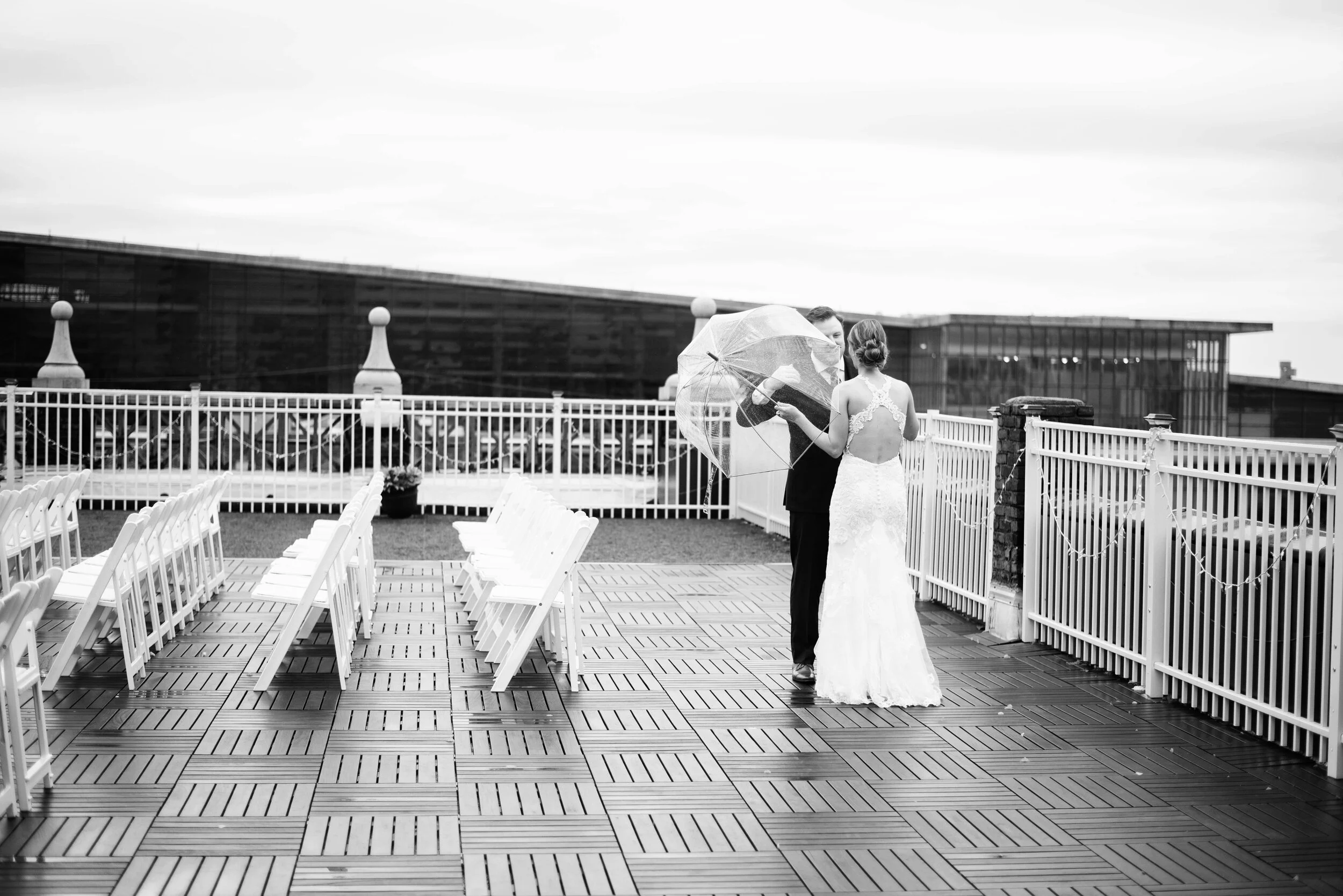 It was a gloomy day to start. The forecast was all rain and mist and fog until at least midday but midwest weather you can never be sure. Luckily their venue, Terrace on Grand, is equipped to deal with both inside and outside scenarios. The ceremony was scheduled for the rooftop and we all had our fingers crossed the entire hair and makeup process (provided by Bombshell Beauty Crew) and just as luck would have it the rain (kind of) stopped just before the first look on the roof (hence the one umbrella you will see the groom holding where the bride opted out once I got her up there).